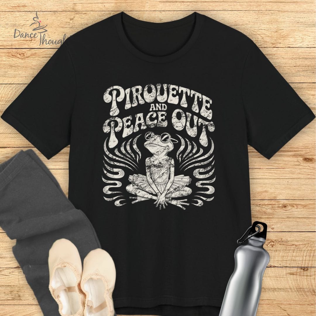 Channeling 1960s counterculture with a ballet twist, this tee features a beatnik frog in a tutu and shades, paired with the phrase "Pirouette and Peace Out" in trippy, vintage typography. A bold white-on-black design for dancers who move to their own rhythm.