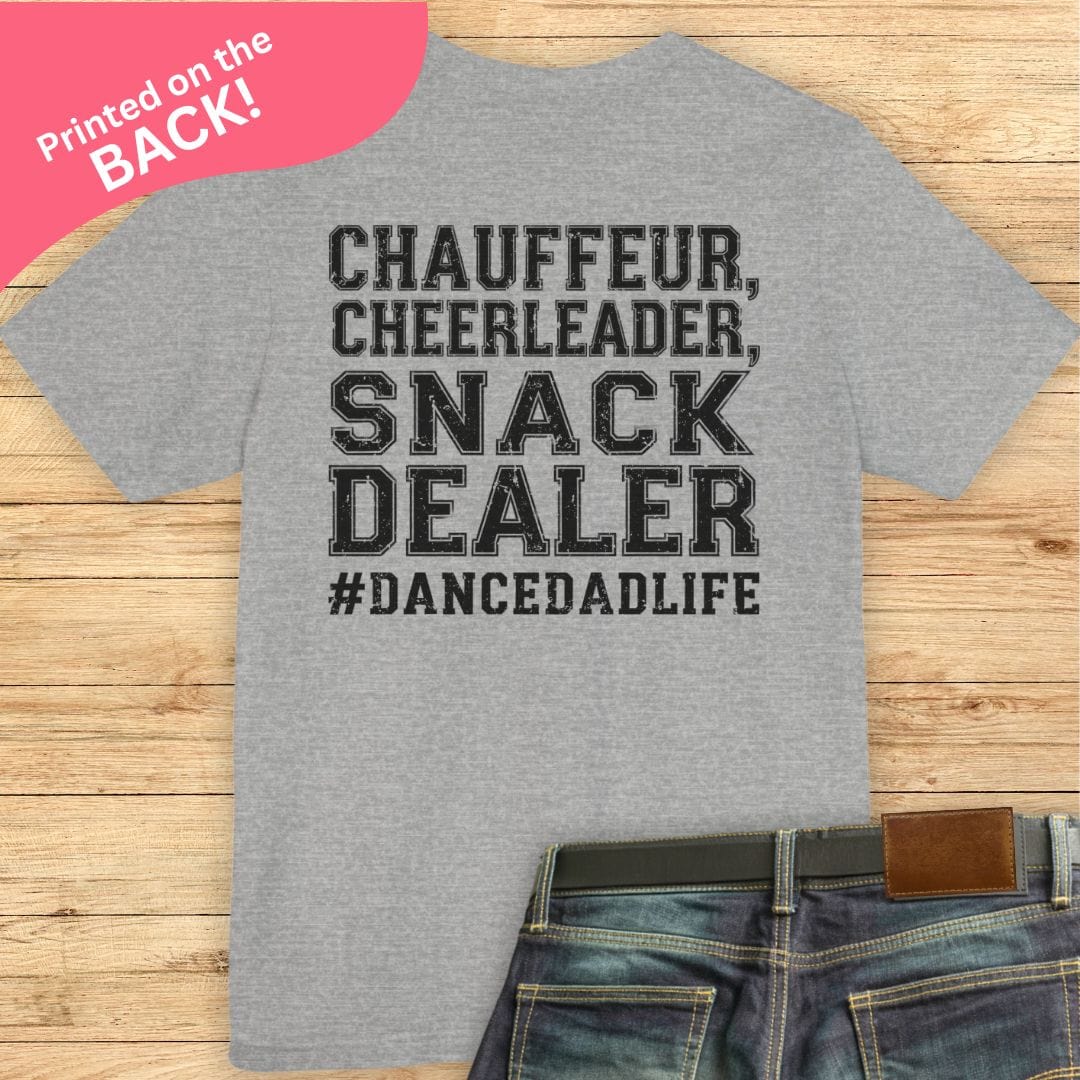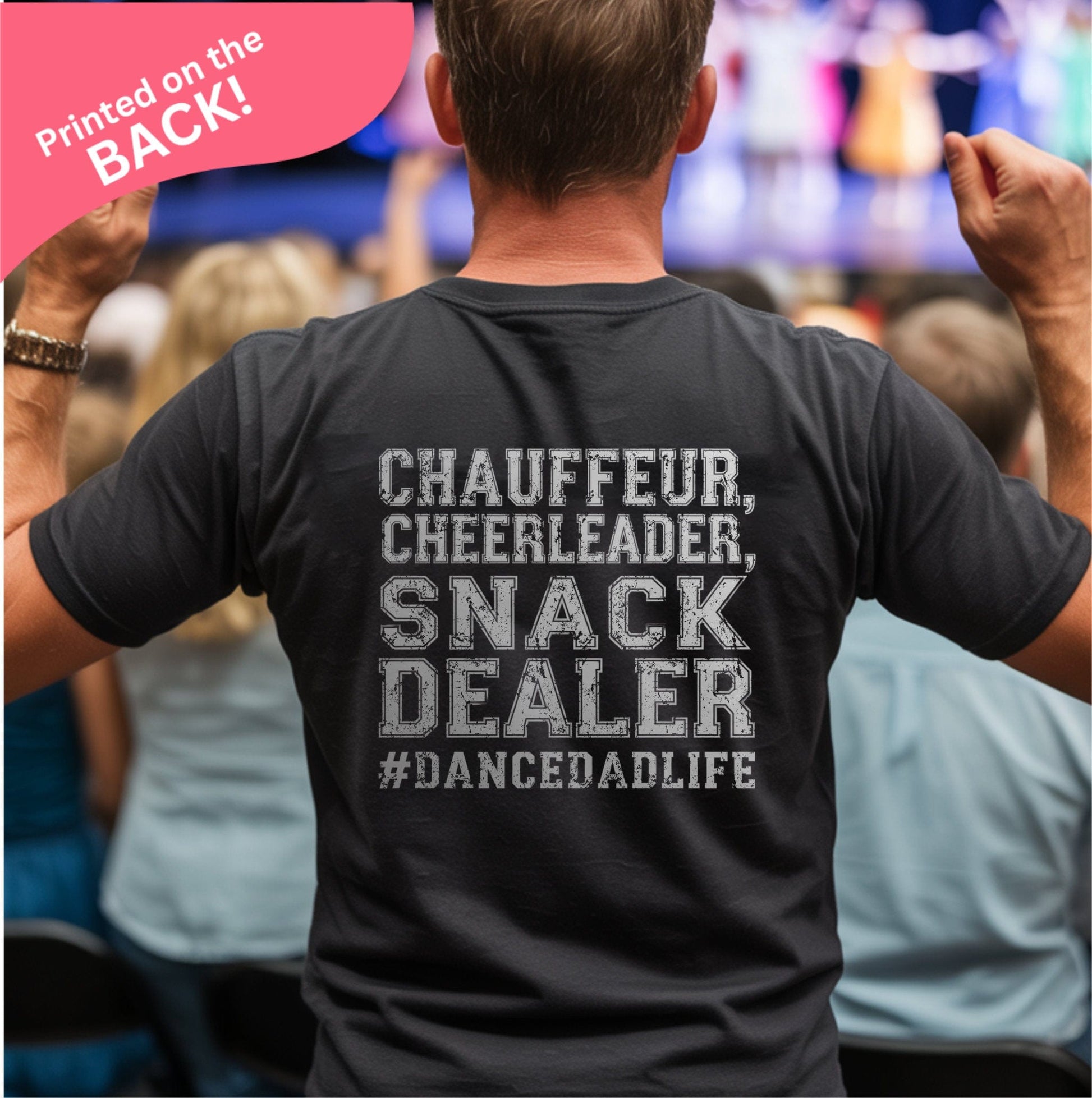 He may not know the routine, but he knows the call time, the coffee order, and exactly where the fruit snacks are. This back print celebrates the dance dad doing it all — behind the wheel, in the crowd, and always on snack duty. Support crew? More like MVP. PRINTED ON THE BACK